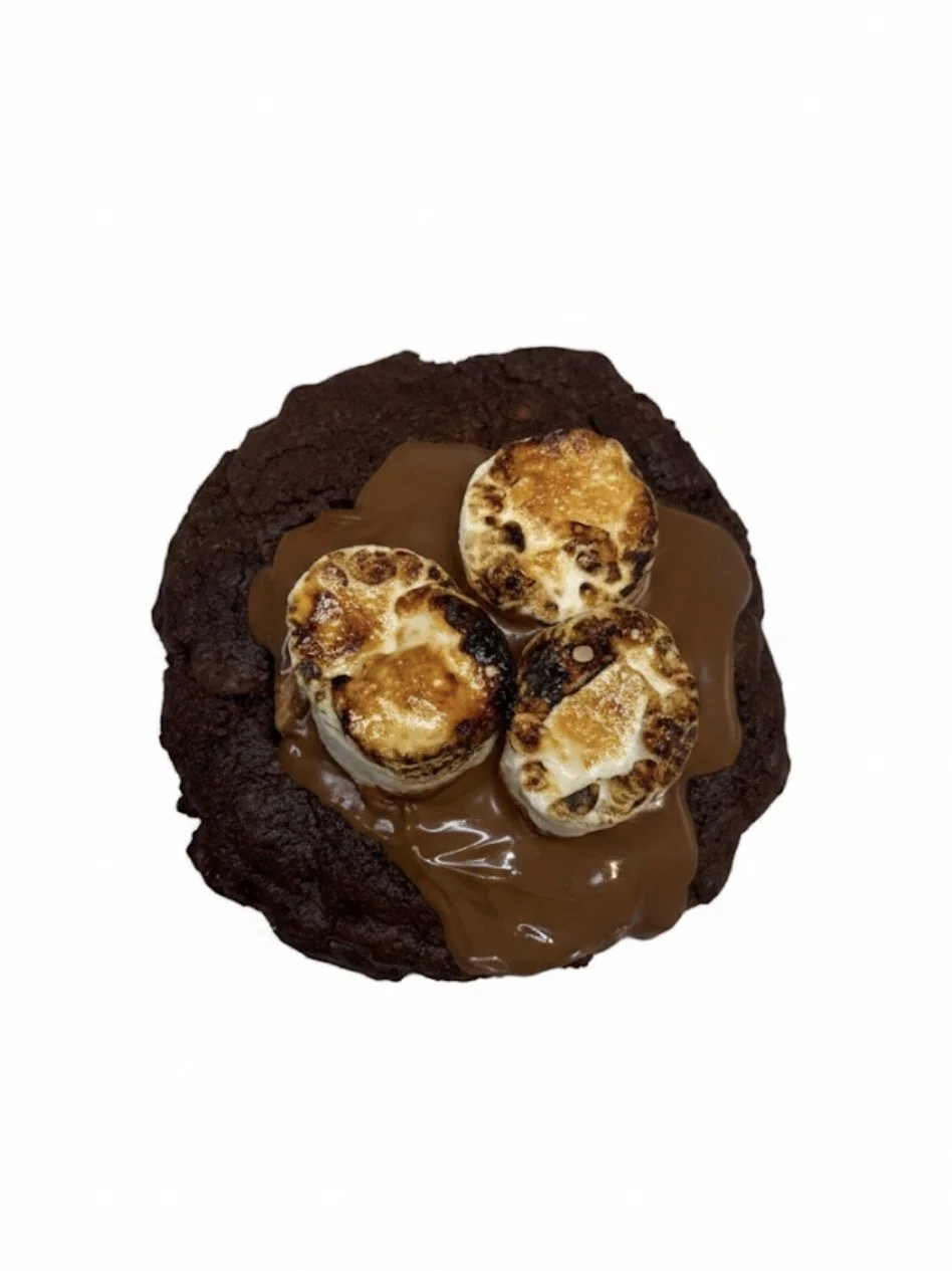 S’mores Cookie - A soft chocolate cookie filled with gooey marshmallow and melty milk chocolate, finished with a graham cracker crunch.