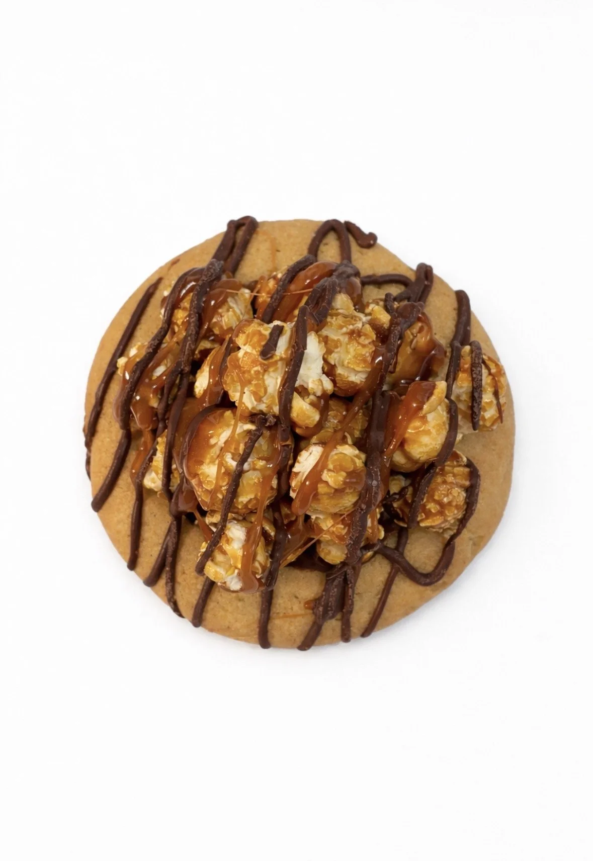 Salted Chocolate Carmel Crunch Cookie - A buttery, golden-brown base packed with white chocolate chips, topped with a swirl of carmel and a swirl of chocolate. Crowned with caramel popcorn. A delicate sprinkle of flaked sea salt on top perfectly balances the rich, sugary sweetness.
