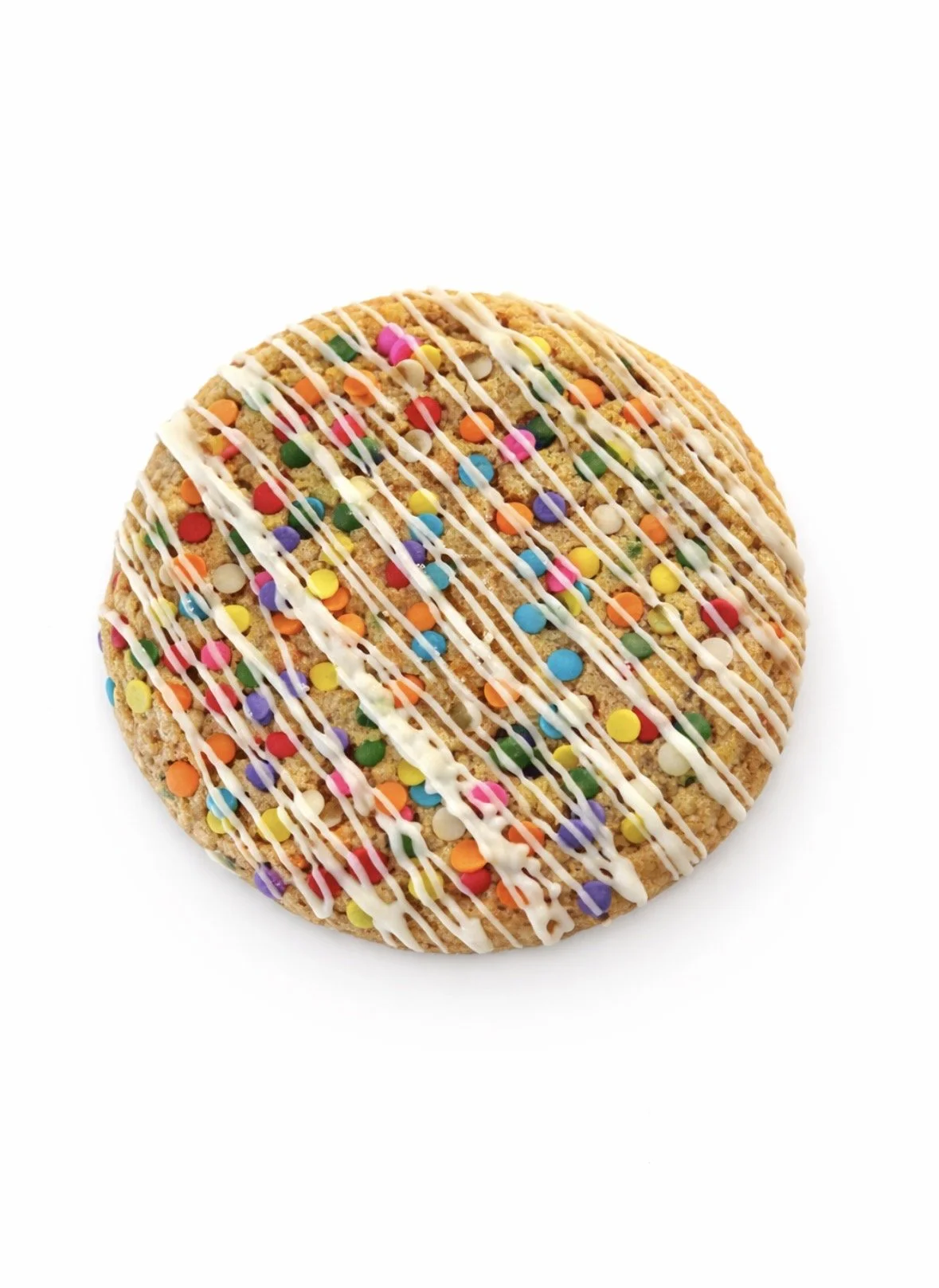 Cake Batter Bliss - A classic vanilla cookie, loaded with confetti sprinkles, backed with white chocolate dipped again in sprinkles, and drizzled with lots more white chocolate.