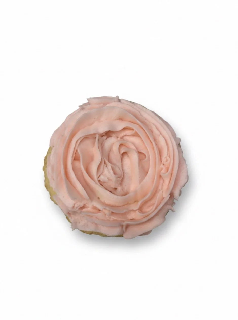 Sugar cookie - A soft, cake-like sugar cookie. Piled high with a towering swirl of pink butter cream icing.